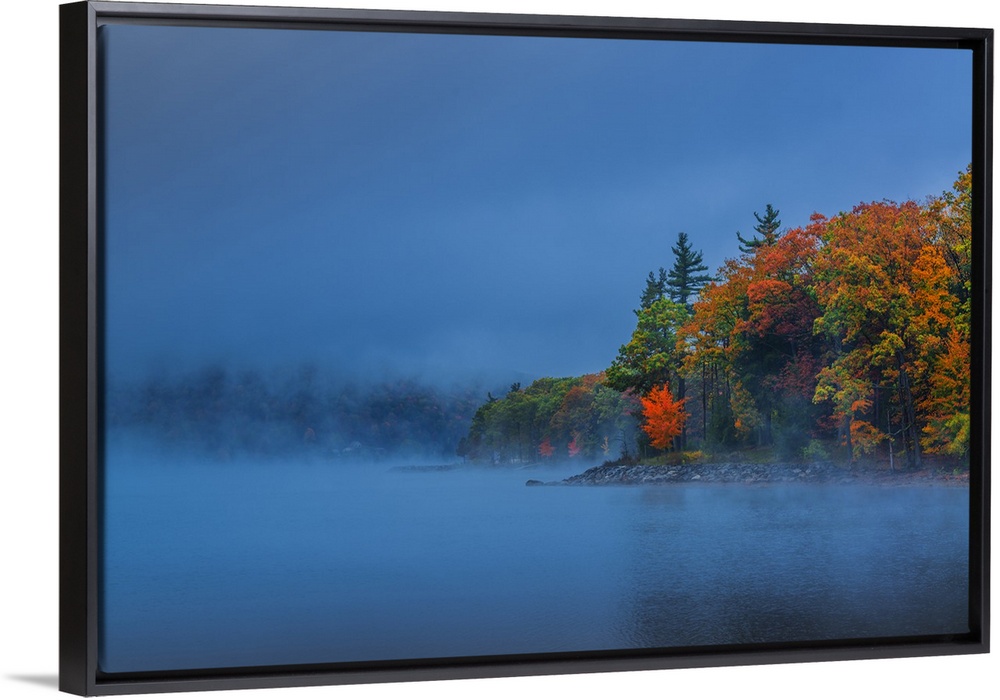 <p>Dense fog over a lake in the evening with autumn trees.</p>