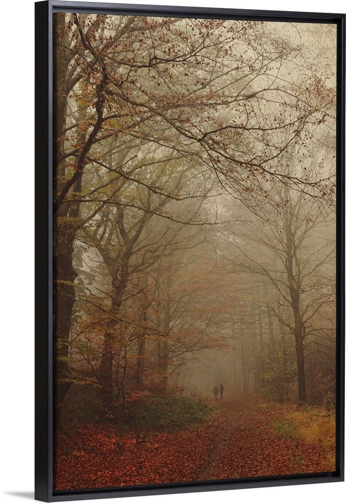 <p>Two unrecognizable persons walking side by side on a path through an autumn forest on a foggy day</p>