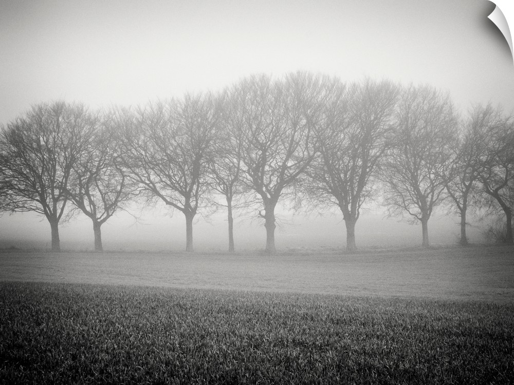 <p>Foggy landscape scene with trees with bare branches</p>