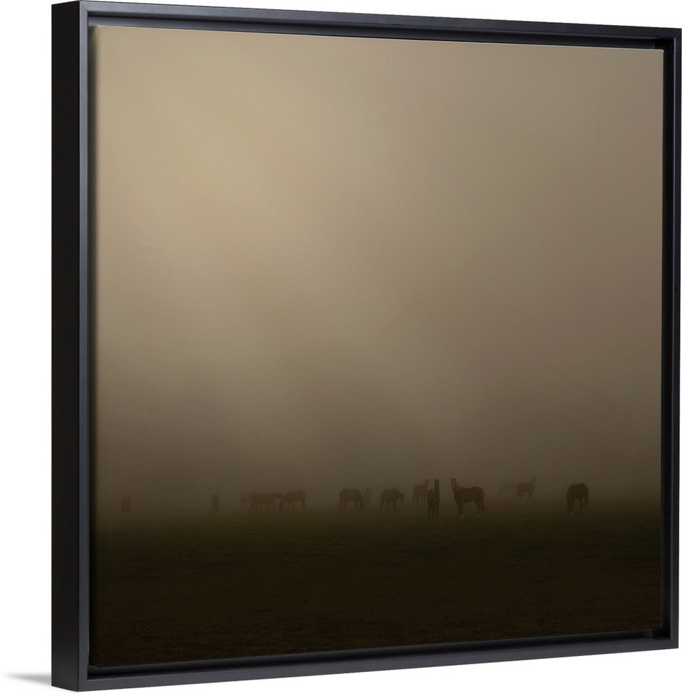 <p>Horses at daybreak on a foggy morning, with beams of sunlight breaking through the clouds</p>