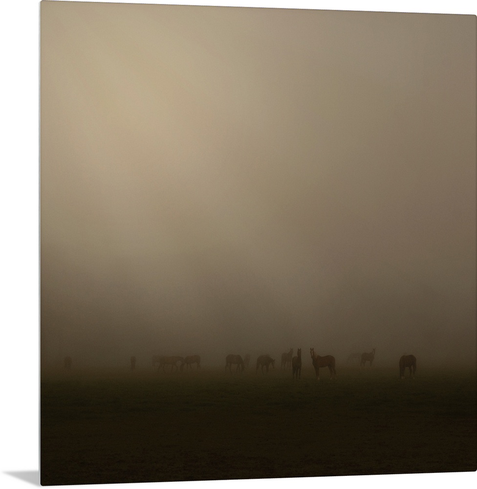 <p>Horses at daybreak on a foggy morning, with beams of sunlight breaking through the clouds</p>