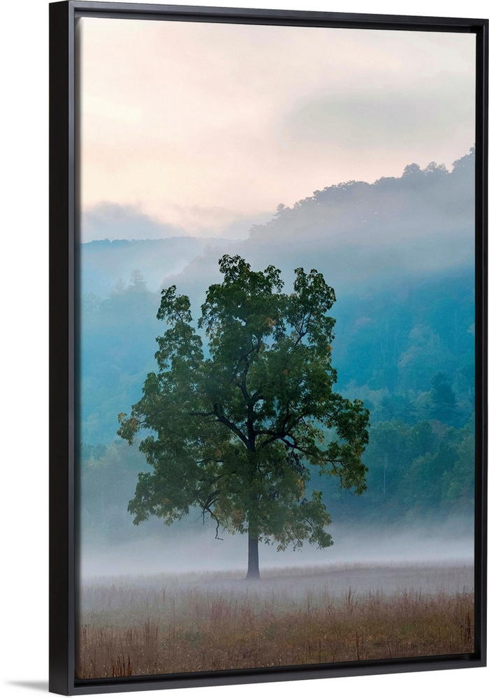 <p>United States, North Carolina, Haywood County, Waynesville. Foggy morning in Cataloochee Valley, Great Smoky Mountains National Park.</p>