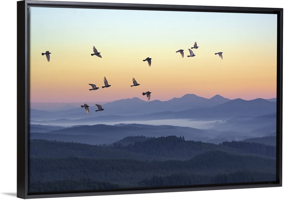<p>Foggy morning in the mountains with flying birds over silhouettes of hills.</p>