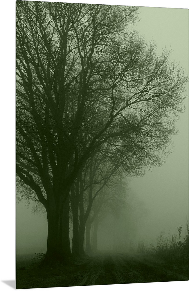 <p>Empty silent road with a row of trees at one side on a foggy day at dawn</p>