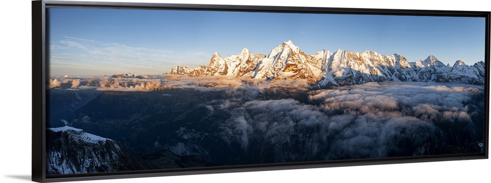 <p>Foggy sky at sunset over majestic rocks of Eiger, Monch and Jungfrau mountains, Murren Birg, Jungfrau Region, Bern, Swiss Alps, Switzerland, Europe</p>