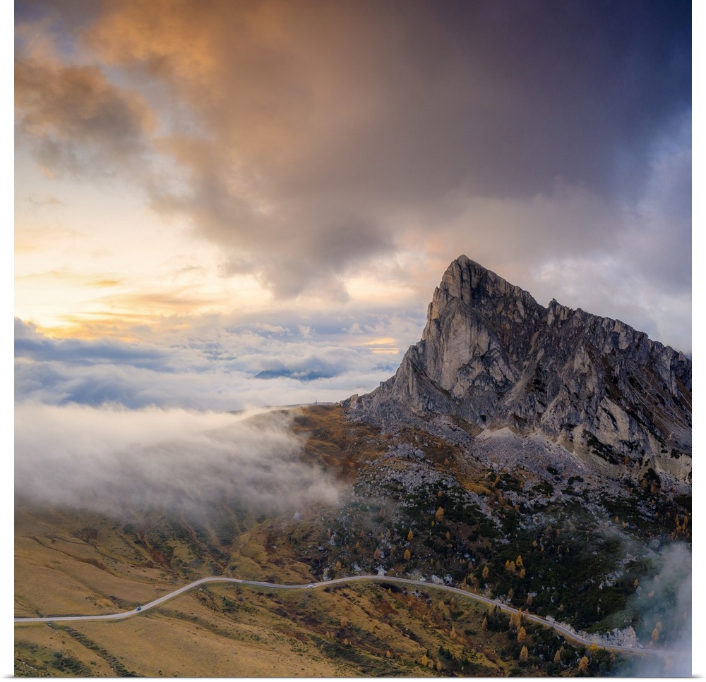 <p>Aerial view by drone of foggy sky at sunset over Ra Gusela and Giau Pass in autumn, Dolomites, Belluno, Veneto, Italy, Europe</p>