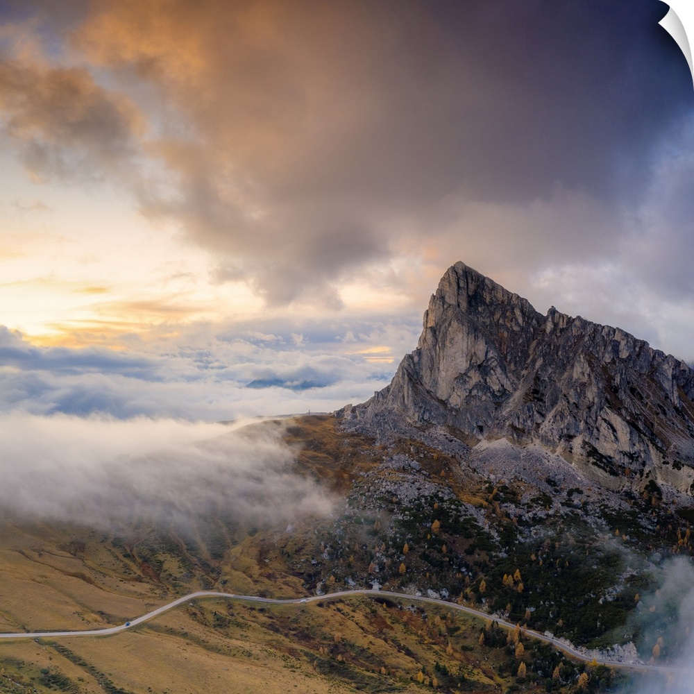 <p>Aerial view by drone of foggy sky at sunset over Ra Gusela and Giau Pass in autumn, Dolomites, Belluno, Veneto, Italy, Europe</p>