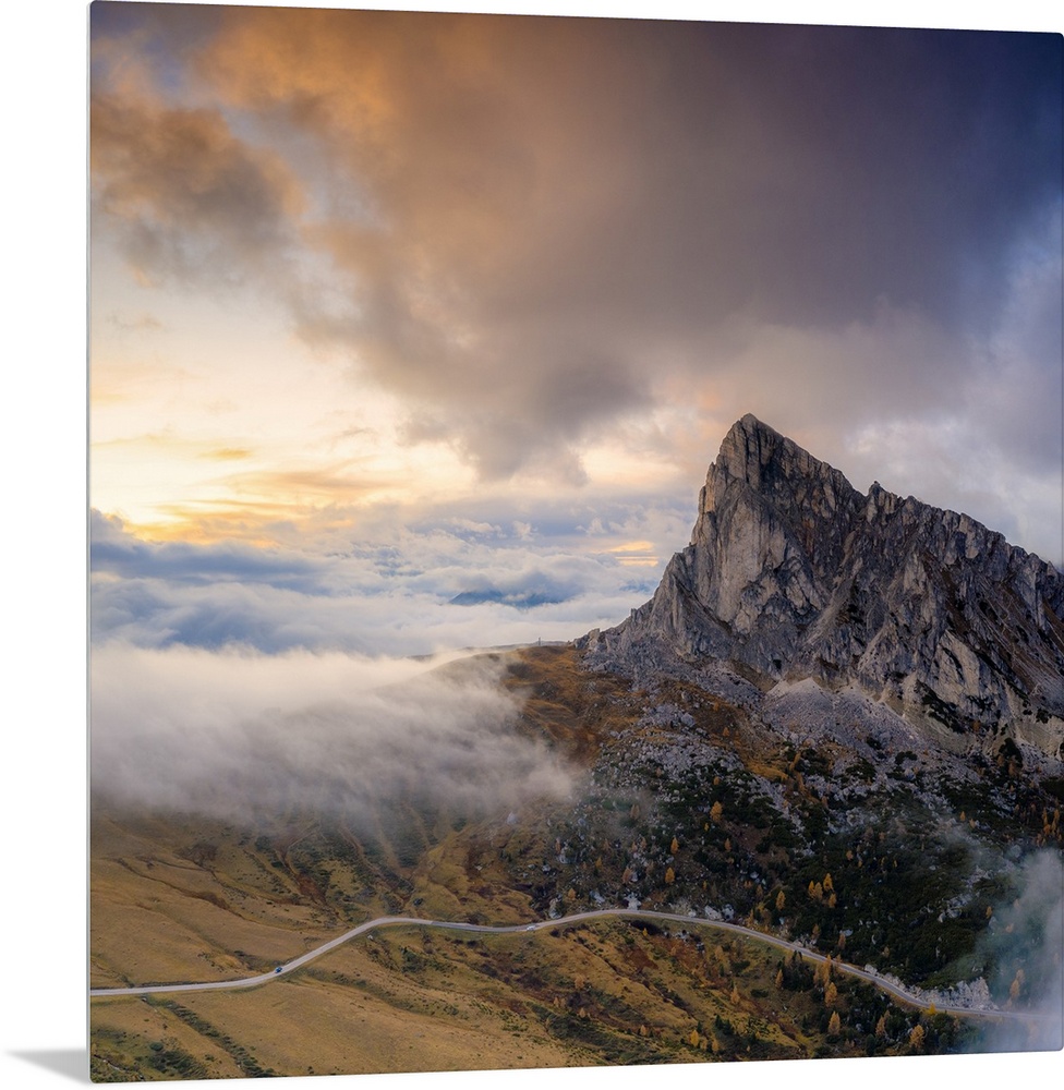 <p>Aerial view by drone of foggy sky at sunset over Ra Gusela and Giau Pass in autumn, Dolomites, Belluno, Veneto, Italy, Europe</p>