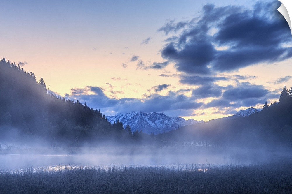 <p>Foggy sunrise at the pond in the Pian di Gembro reserve, Pian di Gembro, Valtellina, Lombardy, Italy, Europe</p>