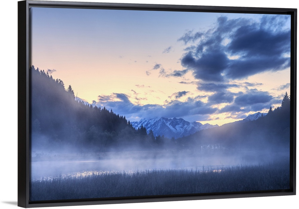 <p>Foggy sunrise at the pond in the Pian di Gembro reserve, Pian di Gembro, Valtellina, Lombardy, Italy, Europe</p>