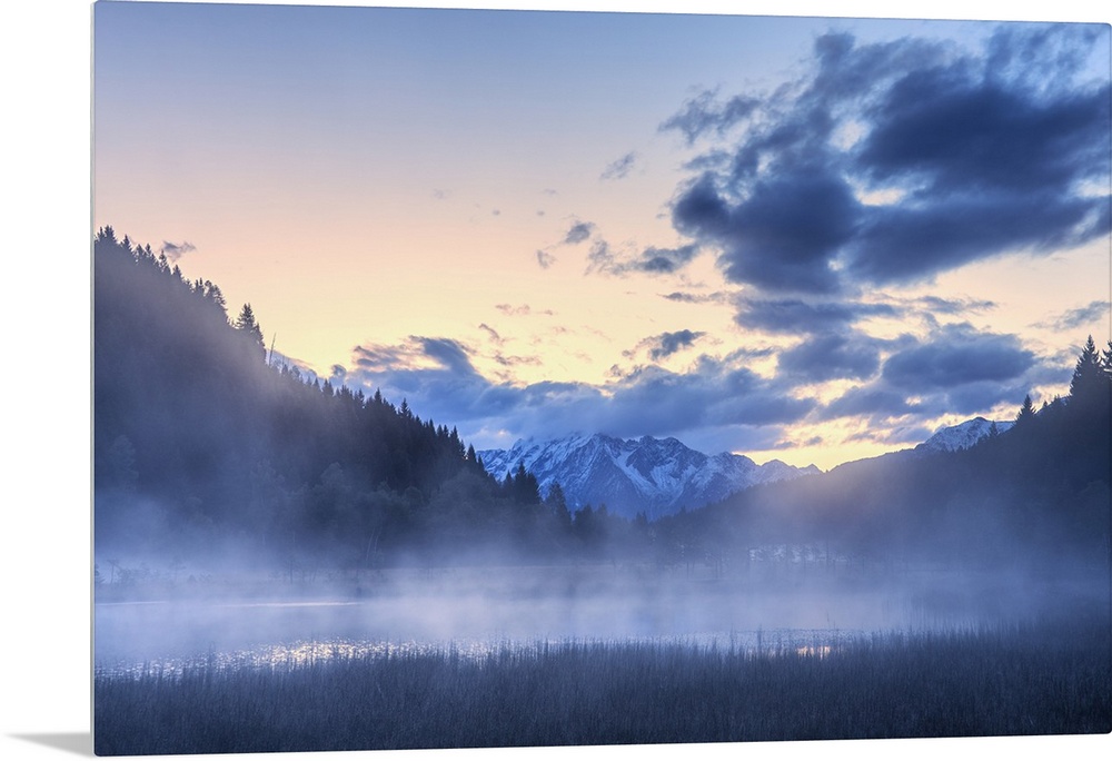 <p>Foggy sunrise at the pond in the Pian di Gembro reserve, Pian di Gembro, Valtellina, Lombardy, Italy, Europe</p>