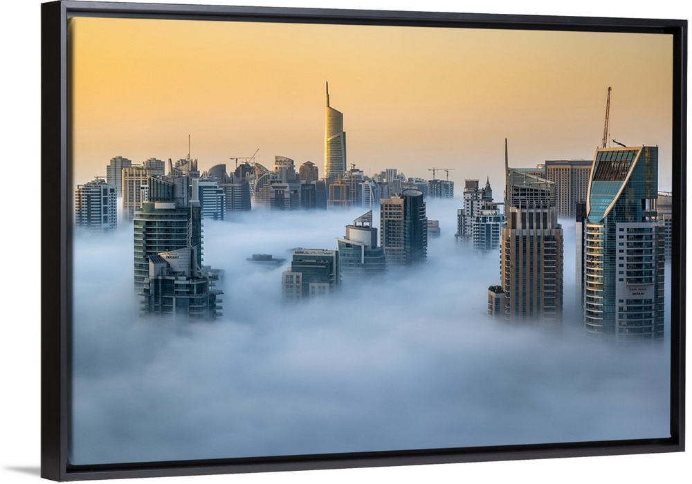 <p>Foggy sunrise with Dubai Marina's skyscrapers towering over the low clouds, Dubai, United Arab Emirates.</p>