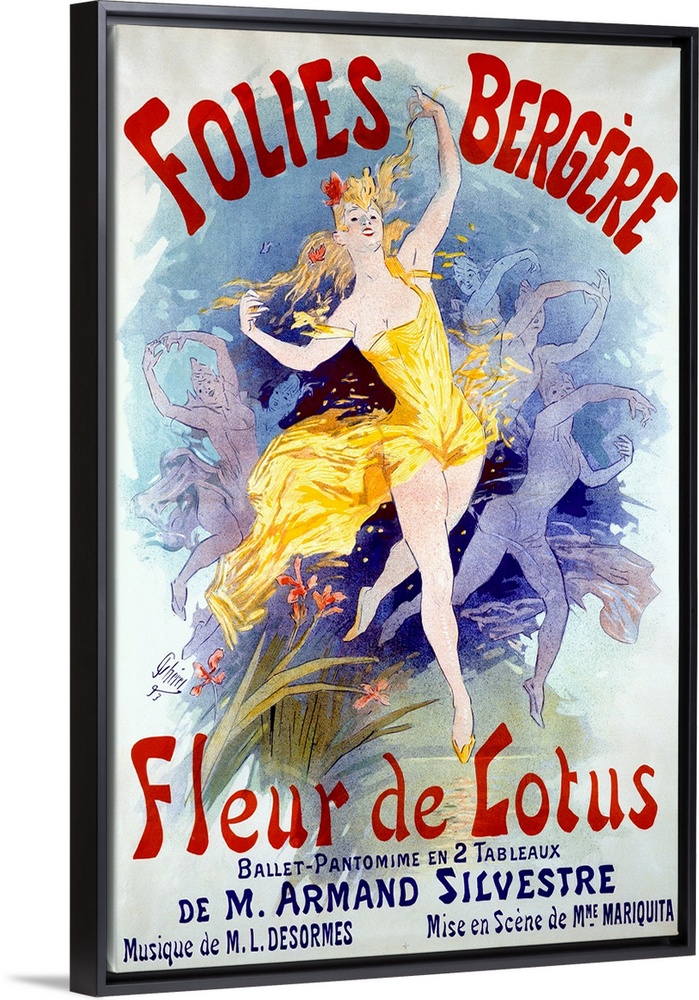 <p>Dancing showgirls at the Follies Bergere. Cheret executed more than 60 posters for the Folies-Bergere between 1874, when the first major expansion of business took place.and 1897, the very zenith of its success. The names of the revues hardly matter, as all were meant mainly to present beautiful girls in attractive settings, and for Fleur de Lotus, Cheret makes a spectacularly exuberant design, a masterpiece of graceful motion and pure joy.</p>