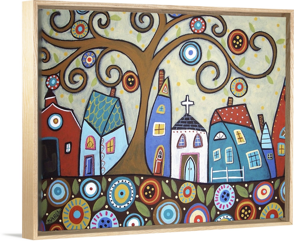 <p>Contemporary painting of a village made of different colored houses with a large tree with curly branches.</p>