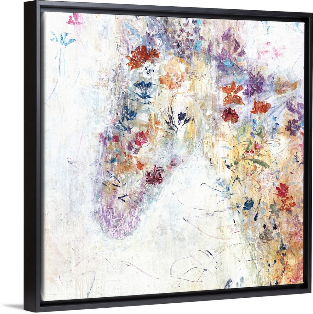 <p>Square abstract painting of a colorful horse with spring flowers on top.</p>