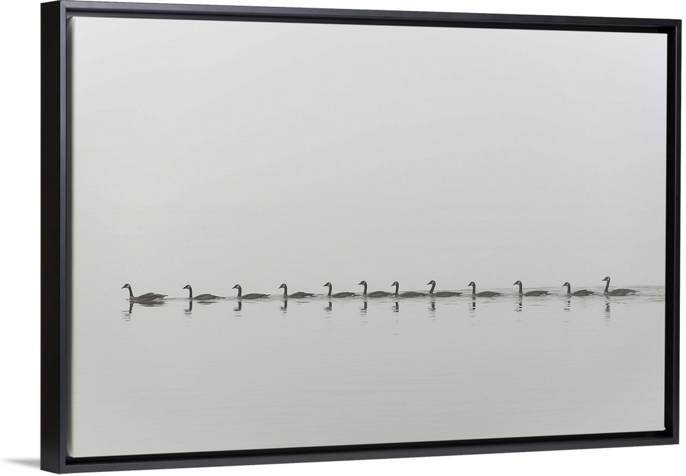 <p>A flock of Canada Geese in a straight line on the water.</p>