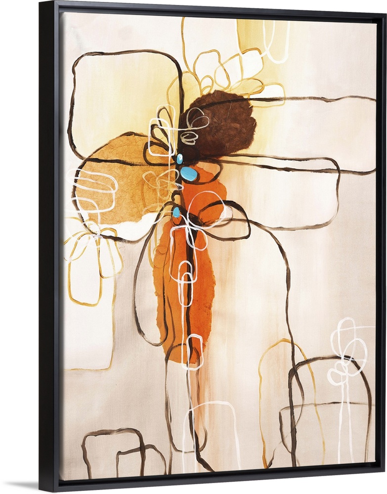 <p>Abstract painting of a flower using rounded geometric shapes in shades of brown and orange with three small pops of bright blue.</p>