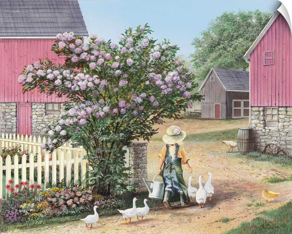 <p>Painting of a child leading geese to be fed.</p>