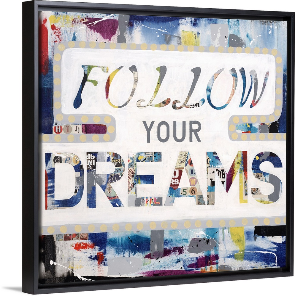 <p>The words "follow your dreams" made of a newsprint collage, outlined in white.</p>