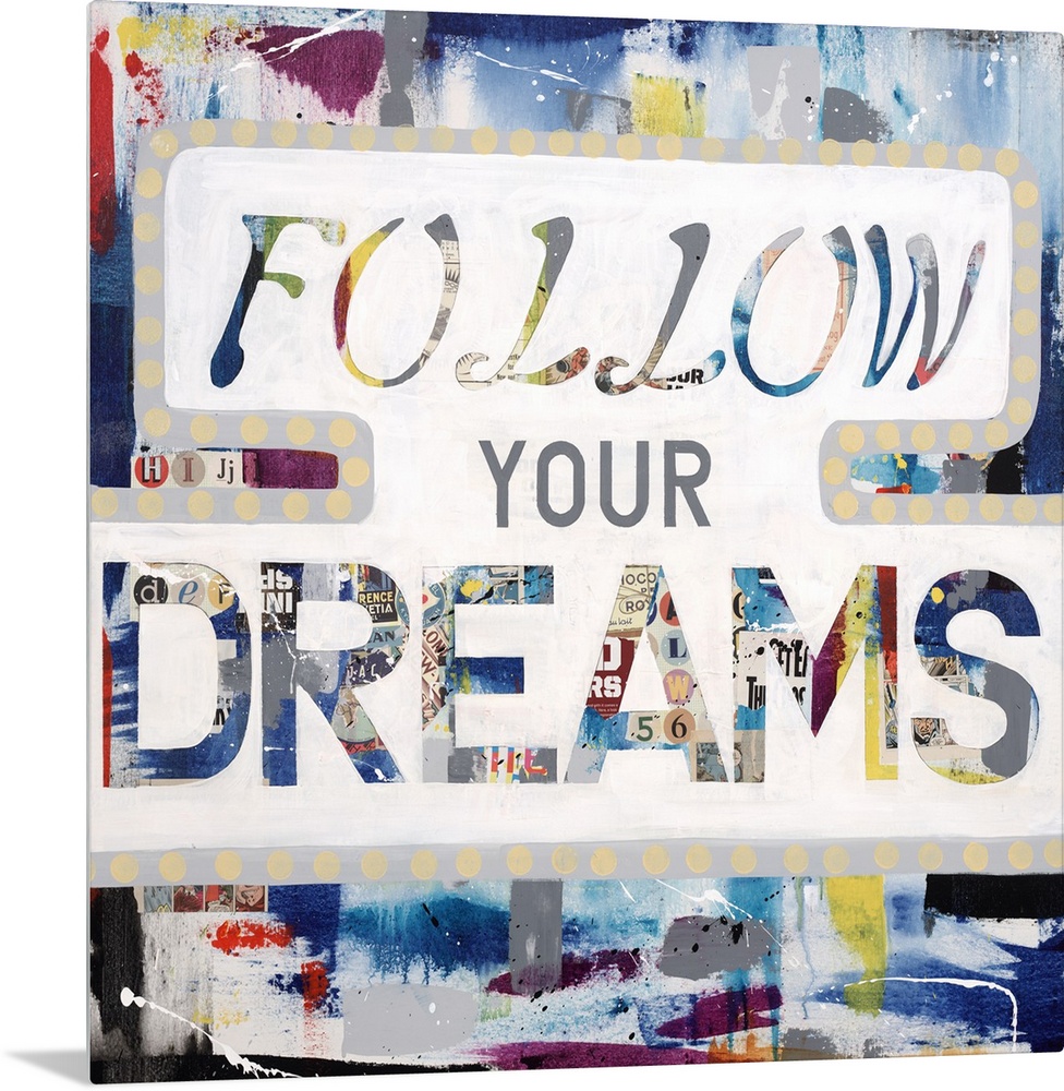 <p>The words "follow your dreams" made of a newsprint collage, outlined in white.</p>