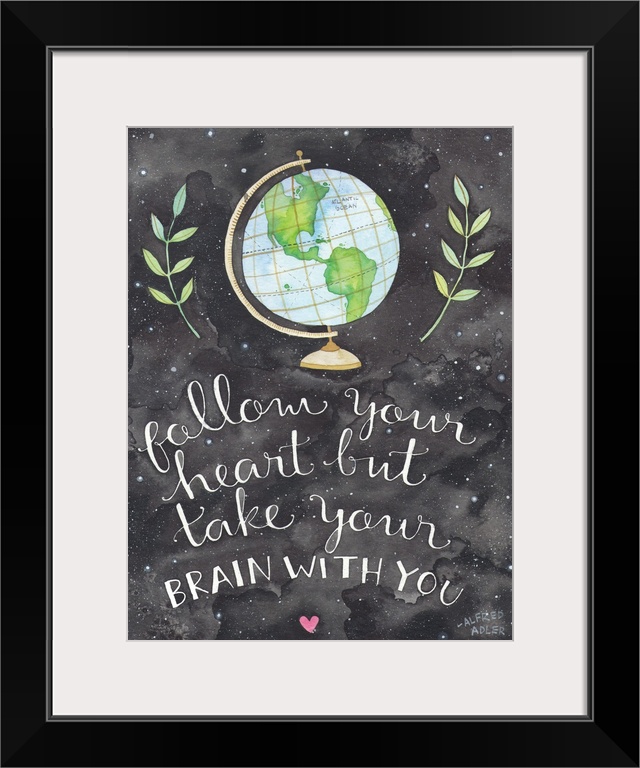 <p>Contemporary painting of a globe over a hand-lettered inspirational quote.</p>