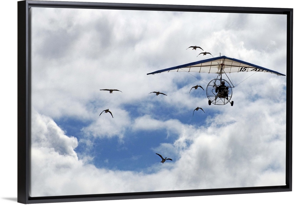 <p>A flock of geese following a powered hang glider in the sky.</p>