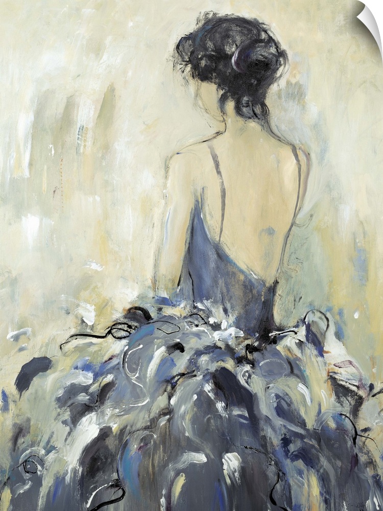 <p>Contemporary painting of a woman with back turned to viewer wearing an elegant dress.</p>