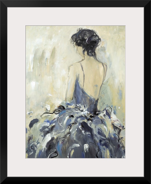 <p>Contemporary painting of a woman with back turned to viewer wearing an elegant dress.</p>
