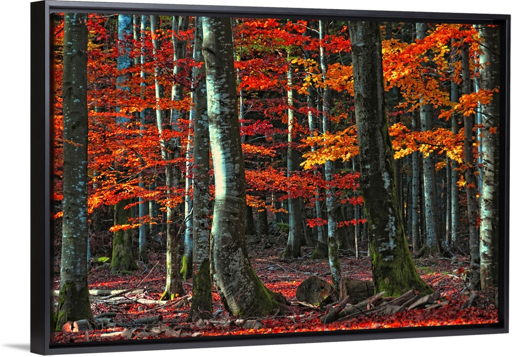 <p>Decorative artwork for the home or office that is a photograph taken of a dense forest during autumn with leaves covering the ground.</p>