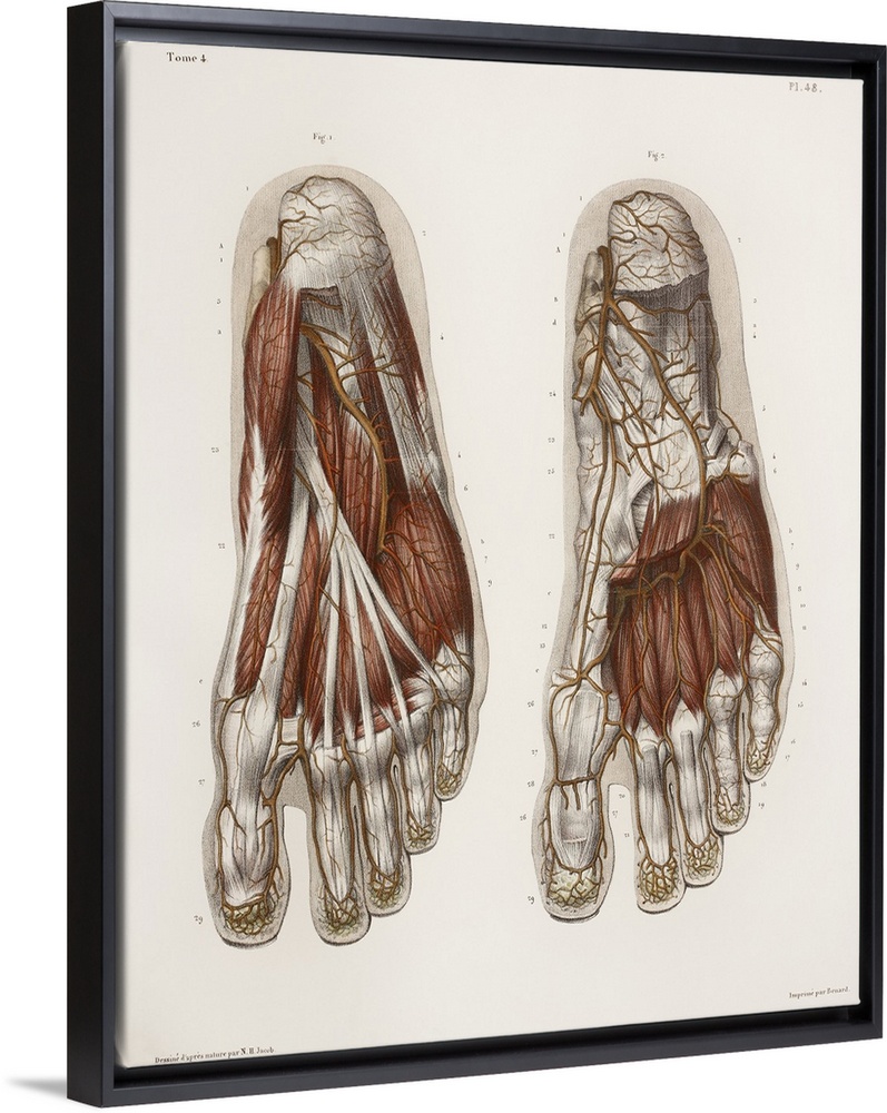 <p>Foot anatomy, 19th Century illustration. Historical hand coloured lithographic print showing the muscles (brown), tendons (white) and blood vessels (red) of the human foot. Image from 'Traite complet de l'anatomie de l'homme, comprenant la medecine operatoire' Vol. 4 (1836), by Jean-Baptiste Marc Bourgery and illustrated by Nicolas-Henri Jacob.</p>