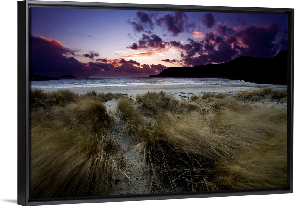 <p>A dramatic seascape sky of blues, purples and pinks over a beach and dunes with windblown marram grasses.</p>