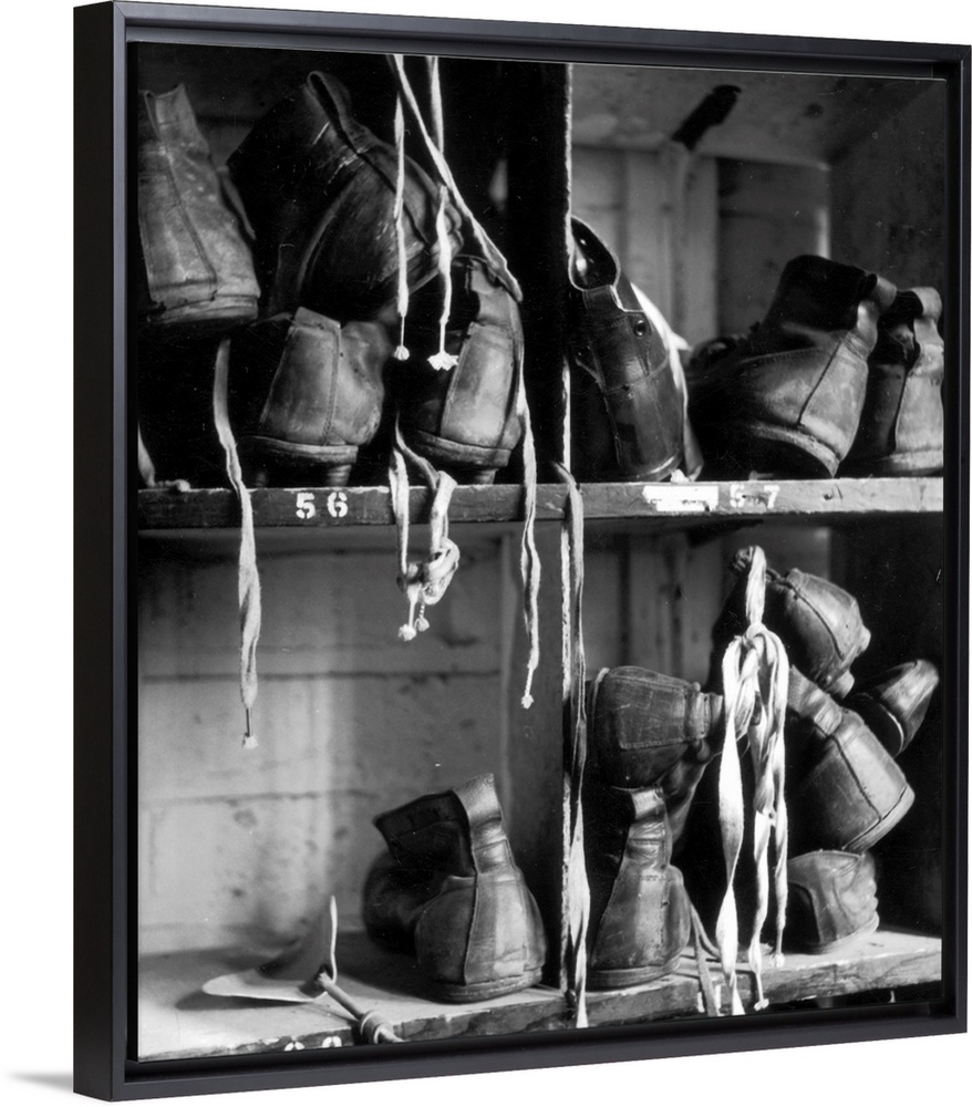 <p>Football boots stacked in players' lockers at Wolverhampton Wanderers' ground Molyneux Original Publication: Picture Post - 6206 - Catch 'Em Young - pub 1952</p>