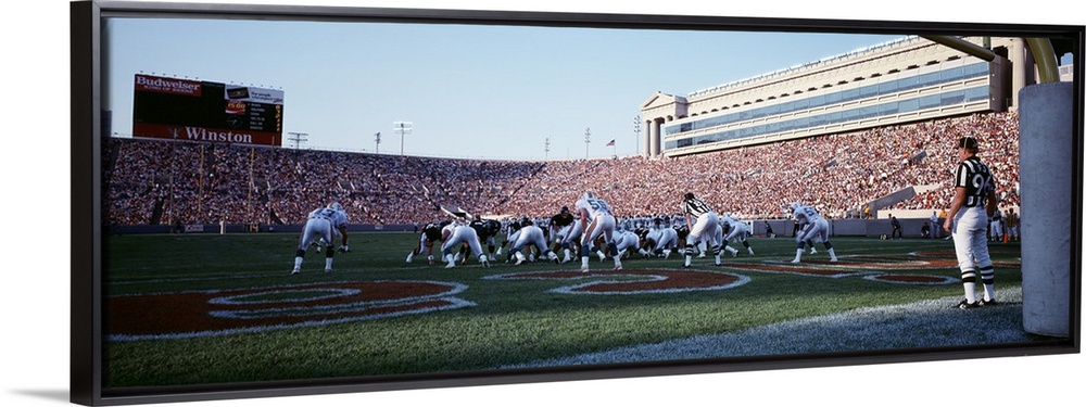 <p>Panoramic picture taken of the Chicago bears on the field at the scrimmage line with the stadium seats filled in front of them.</p>