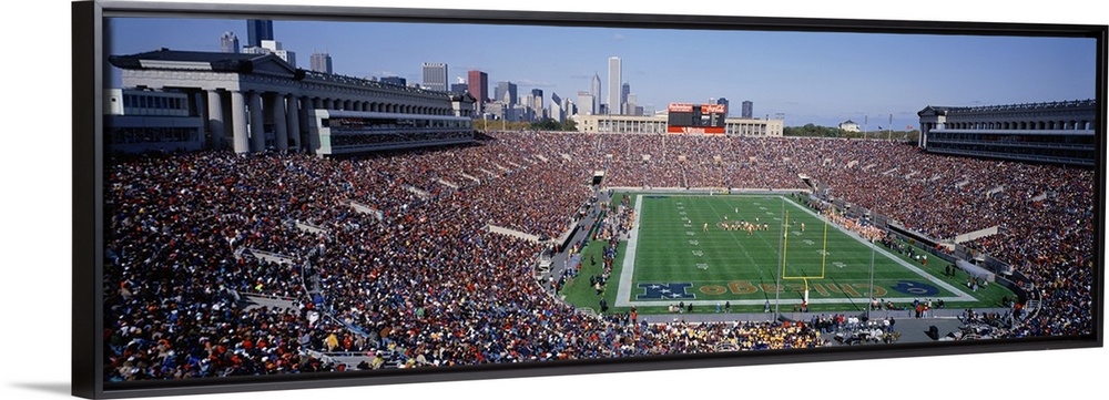 <p>Panoramic photograph of NFL stadium with the city's skyline in the distance under clear skies. The arena is filled with fans watching the Chicago Bears play a game.</p>