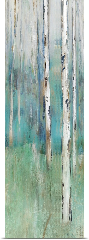 <p>Abstract painting of a forest in muted blues and greens.</p>