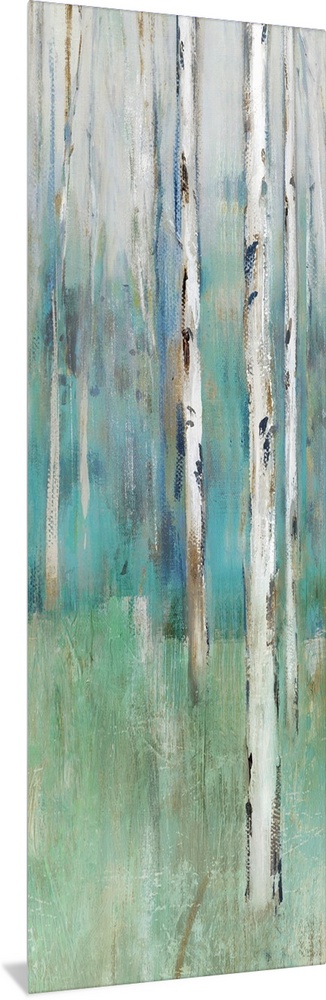 <p>Abstract painting of a forest in muted blues and greens.</p>