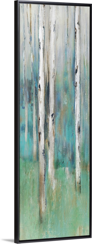 <p>Abstract painting of a forest in muted blues and greens.</p>