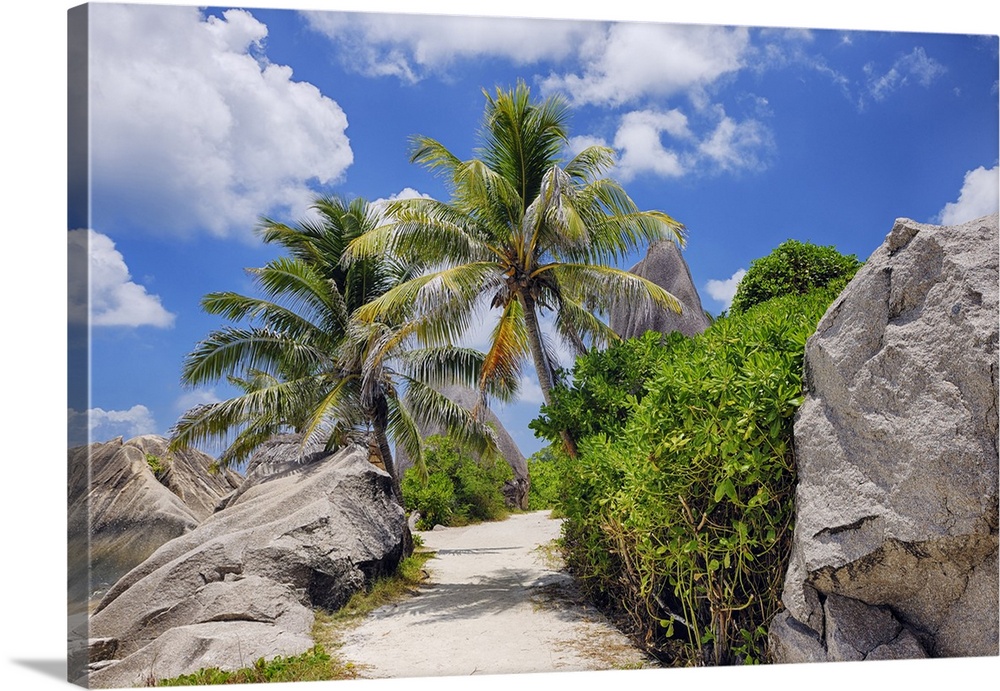 <p>Footpath through Rocks and Palm Trees, Anse Source doArgent, La Digue, Seychelles</p>