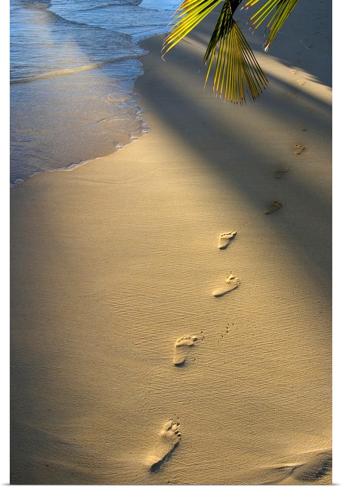 <p>Vertical photograph on a large wall hanging of a single row of footprints in the sand, near the shoreline. The sun shines down on to the beach and a palm branch hangs overhead.</p>