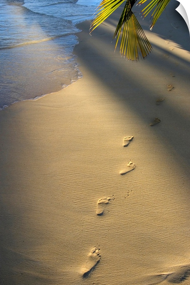 <p>Vertical photograph on a large wall hanging of a single row of footprints in the sand, near the shoreline. The sun shines down on to the beach and a palm branch hangs overhead.</p>