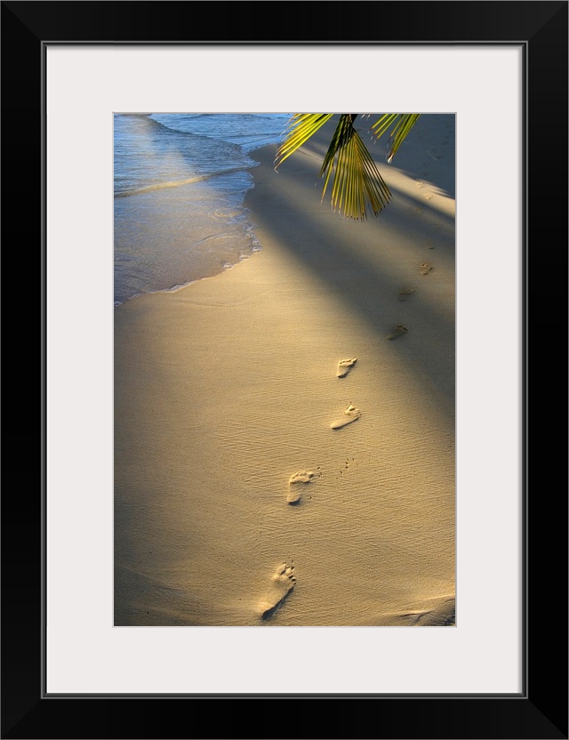 <p>Vertical photograph on a large wall hanging of a single row of footprints in the sand, near the shoreline. The sun shines down on to the beach and a palm branch hangs overhead.</p>