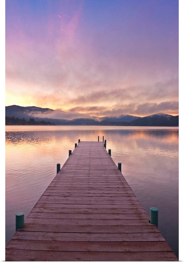 <p>Footprints leading down a frost covered dock at sunrise on Lake Whatcom during Winter, Bellingham Washington, USA.</p>