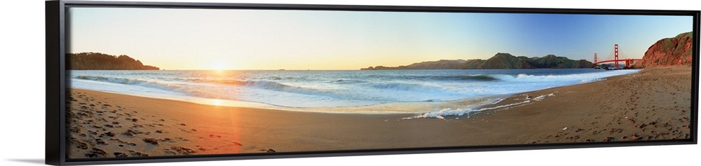 <p>Long panoramic photo of a beach with the golden gate bride on the far right and the setting sun on the far left.</p>