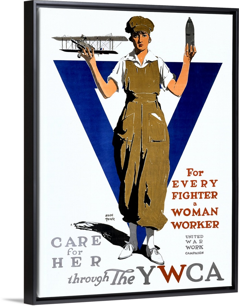 <p>This World War I poster highlights the role of women in wartime production, depicting a female worker holding a model airplane and a shell. Issued by the United War Work Campaign, it appeals for support of the YWCA's services to women contributing on the home front.</p>