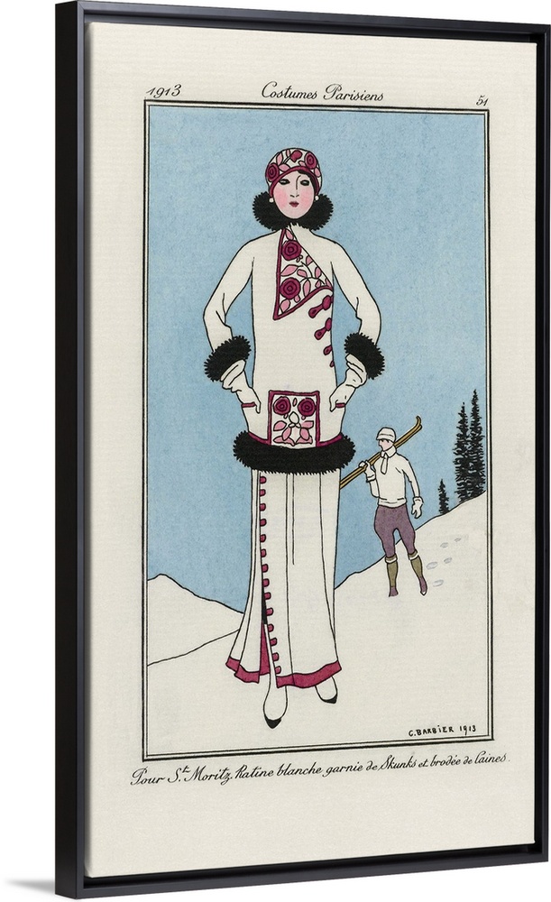<p>Pour St. Moritz. Ratine blanche garnie de Skunks et brodee de laines - For St. Moritz. Trimmed white terry cloth embroidered with wools. Print from the high fashion magazine Journal des Dames et des Modes, published from June 1, 1912 to August 1, 1914. After a work by French illustrator George Barbier, 1882 - 1932.</p>