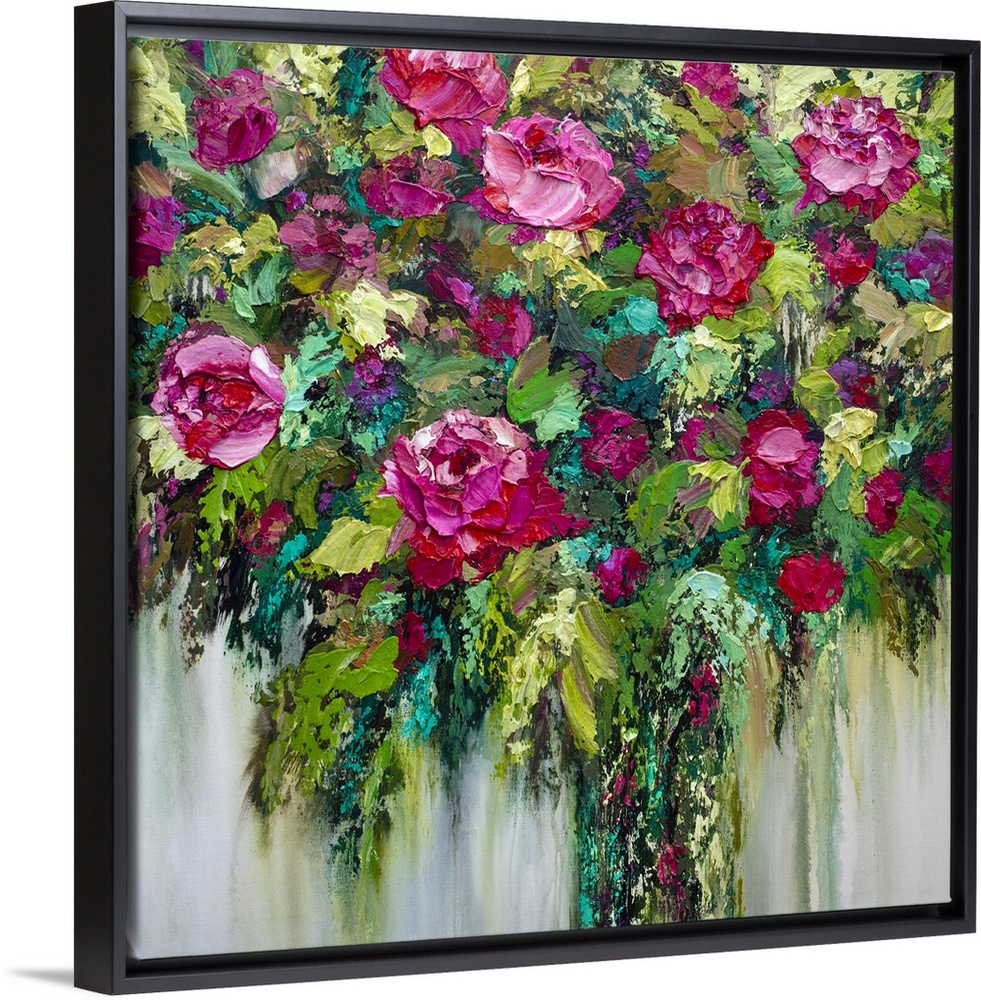 <p>Colorful acrylic floral bouquet painting of red roses and pink flowers by contemporary artist Melissa McKinnon fine art prints</p>