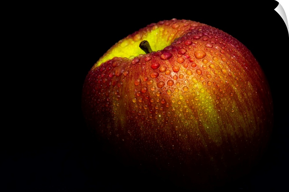 <p>A close up photograph of a fresh Gala apple with waterdrops.</p>