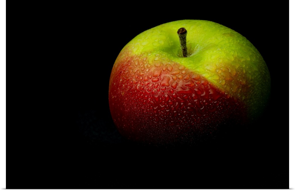 <p>A close up photograph of a fresh Macintosh apple with waterdrops.</p>