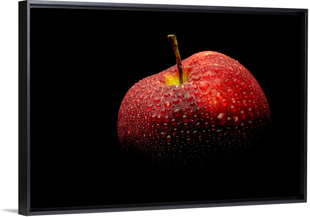 <p>A close up photograph of a fresh Red Delicious apple with waterdrops.</p>