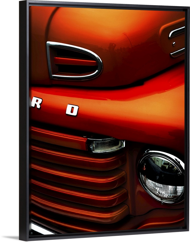 <p>The headlight and front grille of a fiery orange vintage ford truck.</p>
